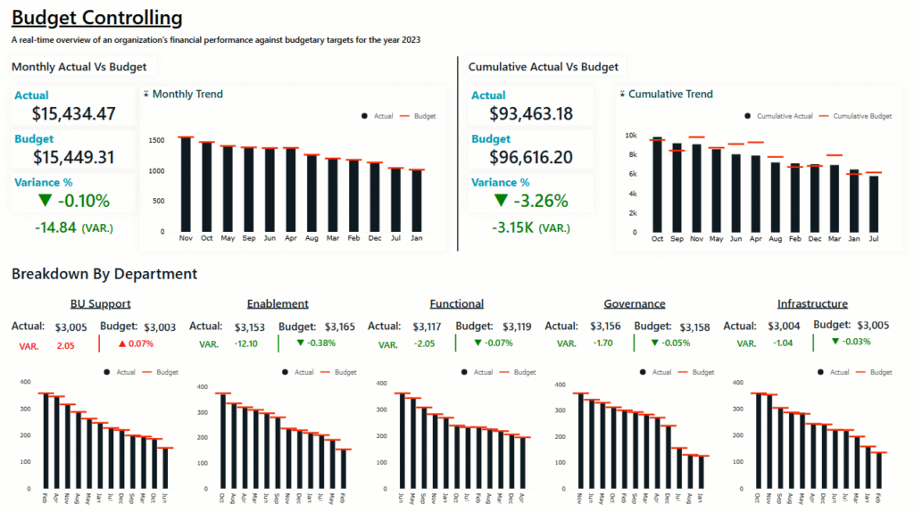 Budget tracking in Power BI helps organizations easily see their financial performance, spot differences between actual and planned spending, and stay on top of their finances with clear comparisons across departments and over time.