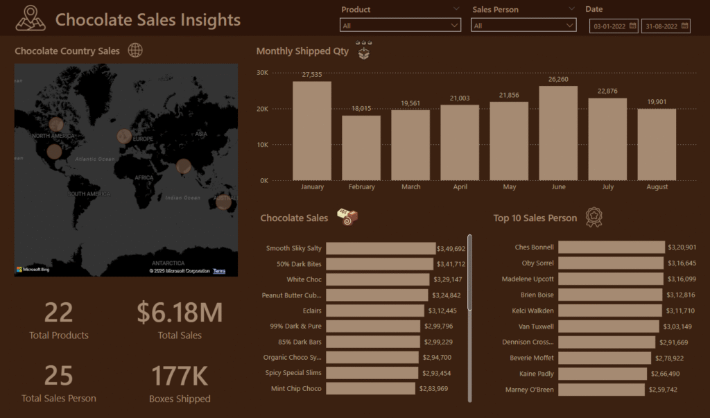 Visualise chocolate product sales across regions and months using dynamic, data-rich charts in Power BI. This dashboard enables companies to monitor product popularity, monthly shipping quantities, and sales team contributions, offering a complete view of sales efficiency and market reach.